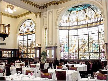 magníficos vitraux art noveau, mesas y sillas