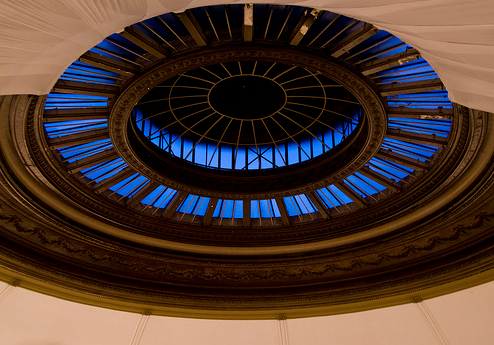 El techo abovedado que culmina en una magnífica cúpula de vidrio y lucernas