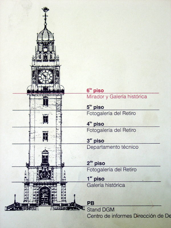 La Torre tiene a la altura de un sexto piso, todo un balcón perimetral en voladizo al que puede accederse además de la escalera, por un ascensor antiguo, vidriado y enrejado que al ir ascendiendo se puede apreciar al costado del mismo el péndulo del reloj de 4 metros de altura y 100 kilos de peso.